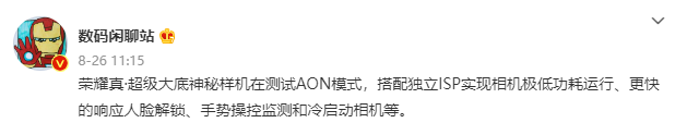 上个月,荣耀举办了全场景新品发布会,推出了荣耀MagicBook 14 锐龙版、荣耀平板8、荣耀X40i、荣耀智慧屏X3系列等新品。随着新品的正式发布,人们开始将关注转移到荣耀的下一代产品上了。近日,网上开始出现了很多关于荣耀新机的爆料信息。据数码博主@数码闲聊站 爆料,荣耀真超级大底神秘样机正在测试AON模式,搭配独立ISP可实现相机极低功耗运行、更快的响应人脸解锁、手势操控监测和冷启动相机等。据资料显示,AON模式通常是指AON协处理器,具有高度集成优点的协处理器,基于Cortex-M0架构,是包含DSP、PMIC等的SRAM,简单概括就是可以超低功耗运行的高能效实时操作系统。此外,该博主还表示荣耀新旗舰手机两颗真超级大底测试中,分别是 1/1.1 英寸和 1 英寸。