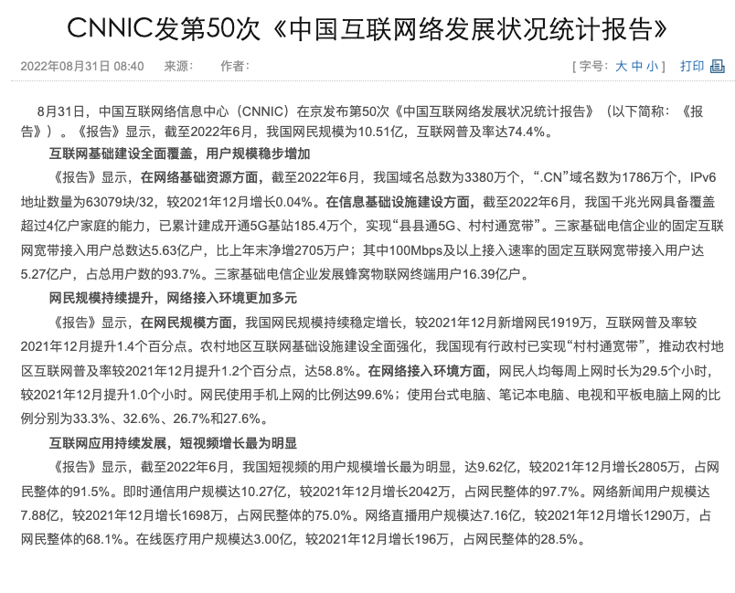 今天,中国互联网络信息中心(CNNIC)正式发布了第50次《中国互联网络发展状况统计报告》。《报告》显示,截至2022年6月,我国网民规模为10.51亿,互联网普及率达74.4%。《报告》显示,在网络基础资源方面,截至2022年6月,我国域名总数为3380万个,“.CN”域名数为1786万个,IPv6地址数量为63079块/32,较2021年12月增长0.04%。在信息基础设施建设方面,截至2022年6月,我国千兆光网具备覆盖超过4亿户家庭的能力,已累计建成开通5G基站185.4万个,实现“县县通5G、村村通宽带”。三家基础电信企业的固定互联网宽带接入用户总数达5.63亿户,比上年末净增2705万户;其中100Mbps及以上接入速率的固定互联网宽带接入用户达5.27亿户,占总用户数的93.7%。三家基础电信企业发展蜂窝物联网终端用户16.39亿户。在网民规模方面,我国网民规模持续稳定增长,较2021年12月新增网民1919万,互联网普及率较2021年12月提升1.4个百分点。在网络接入环境方面,网民人均每周上网时长为29.5个小时,较2021年12月提升1.0个小时。网民使用手机上网的比例达99.6%;使用台式电脑、笔记本电脑、电视和平板电脑上网的比例分别为33.3%、32.6%、26.7%和27.6%。《报告》显示,截至2022年6月,我国即时通信用户规模达10.27亿,较2021年12月增长2042万,占网民整体的97.7%。网络新闻用户规模达7.88亿,较2021年12月增长1698万,占网民整体的75.0%。网络直播用户规模达7.16亿,较2021年12月增长1290万,占网民整体的68.1%。短视频用户规模为9.62亿,较2021年12月增长2805万,占网民整体的91.5%。