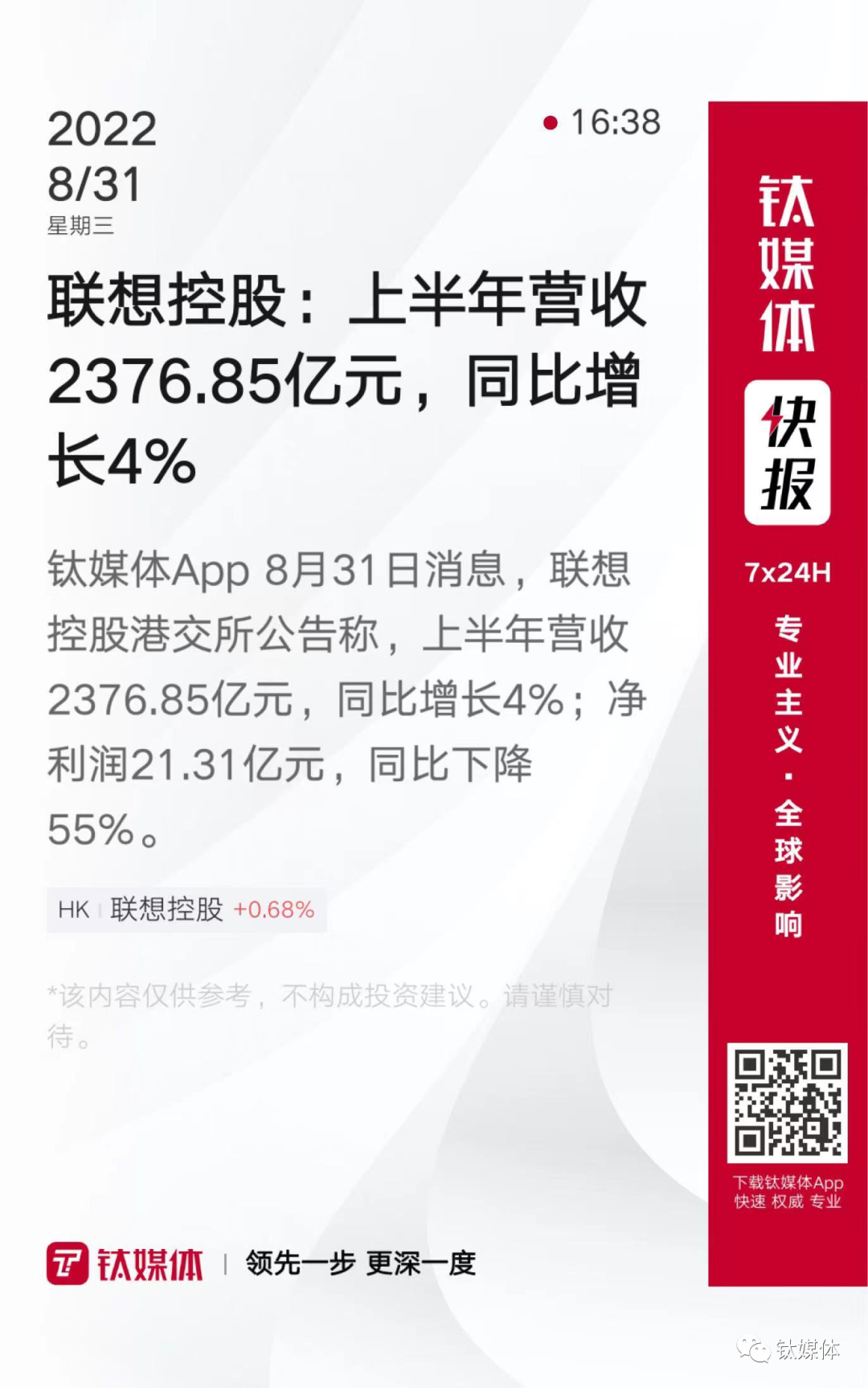 【联想控股:上半年营收2376.85亿元,同比增长4%】