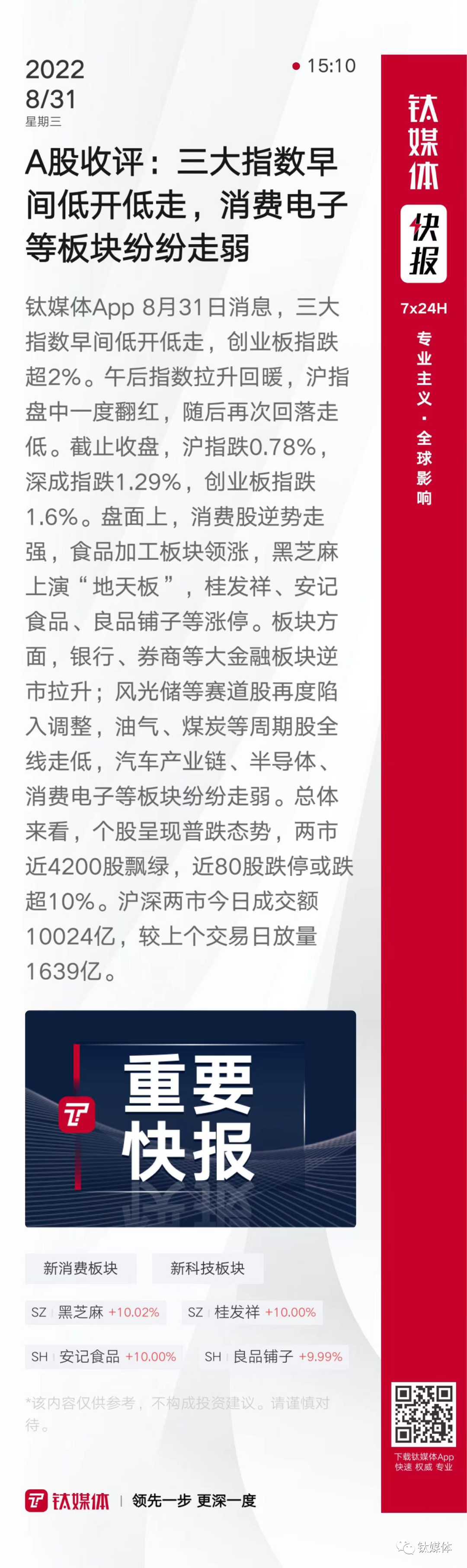 【A股收评:三大指数早间低开低走,消费电子等板块纷纷走弱】