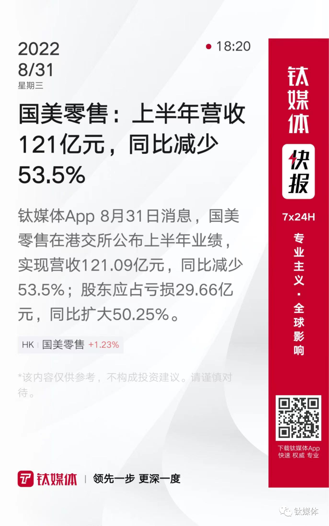 【国美零售:上半年营收121亿元,同比减少53.5%】