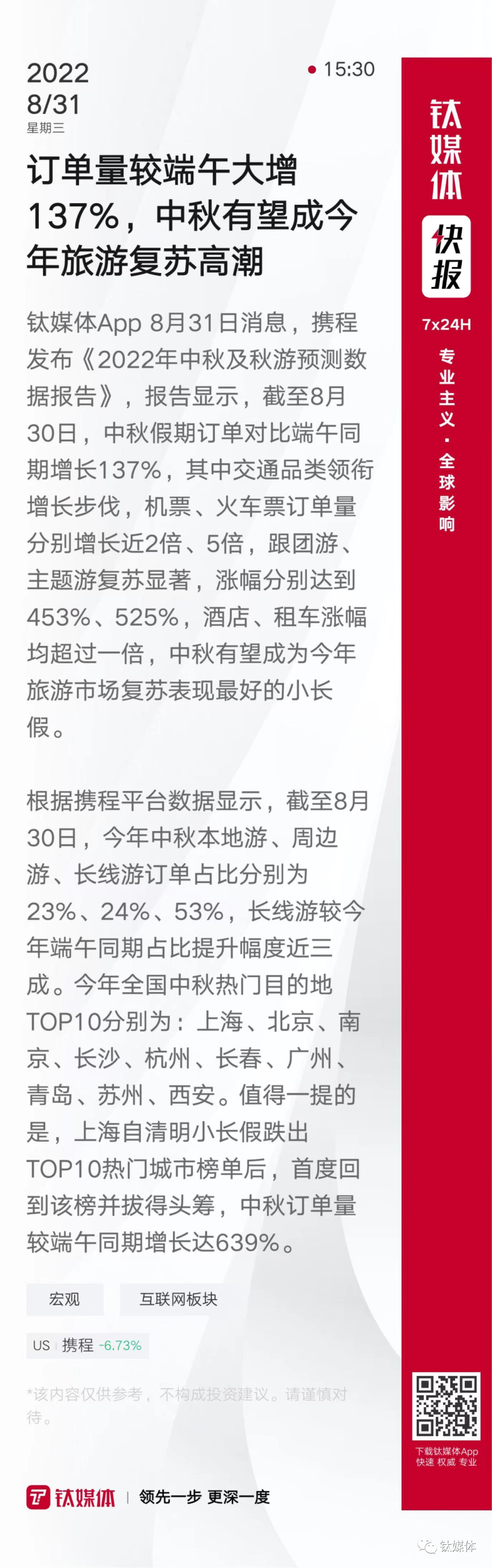 【订单量较端午大增137%,中秋有望成今年旅游复苏高潮】
