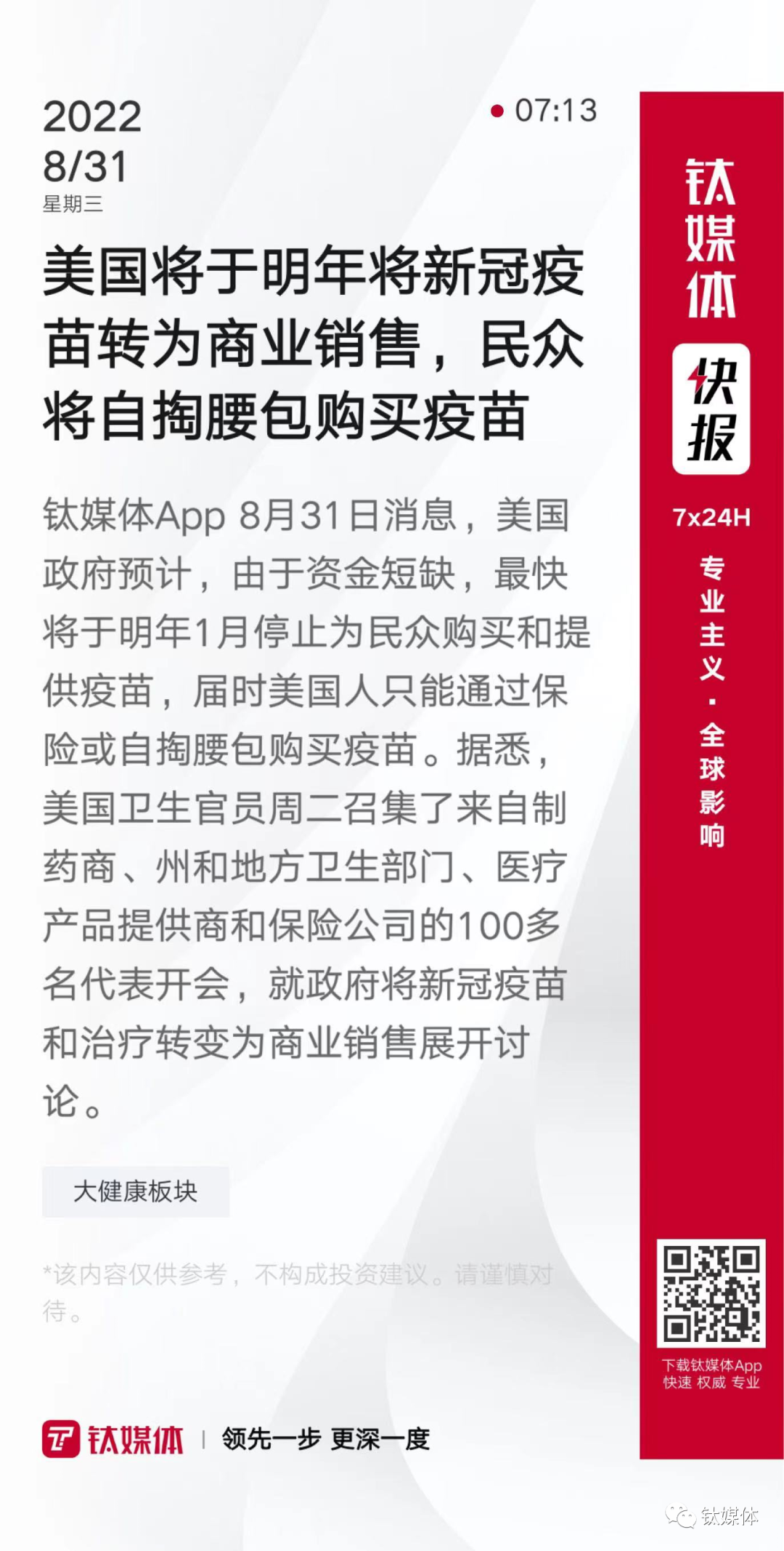 【美国将于明年将新冠疫苗转为商业销售,民众将自掏腰包购买疫苗】