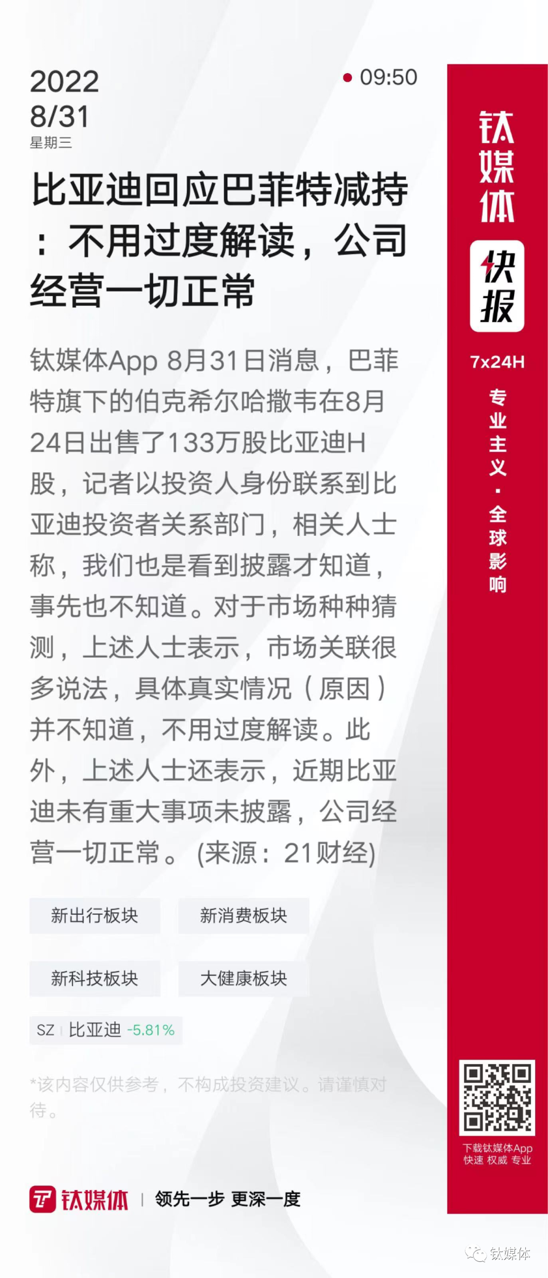 【比亚迪回应巴菲特减持 :不用过度解读,公司经营一切正常】