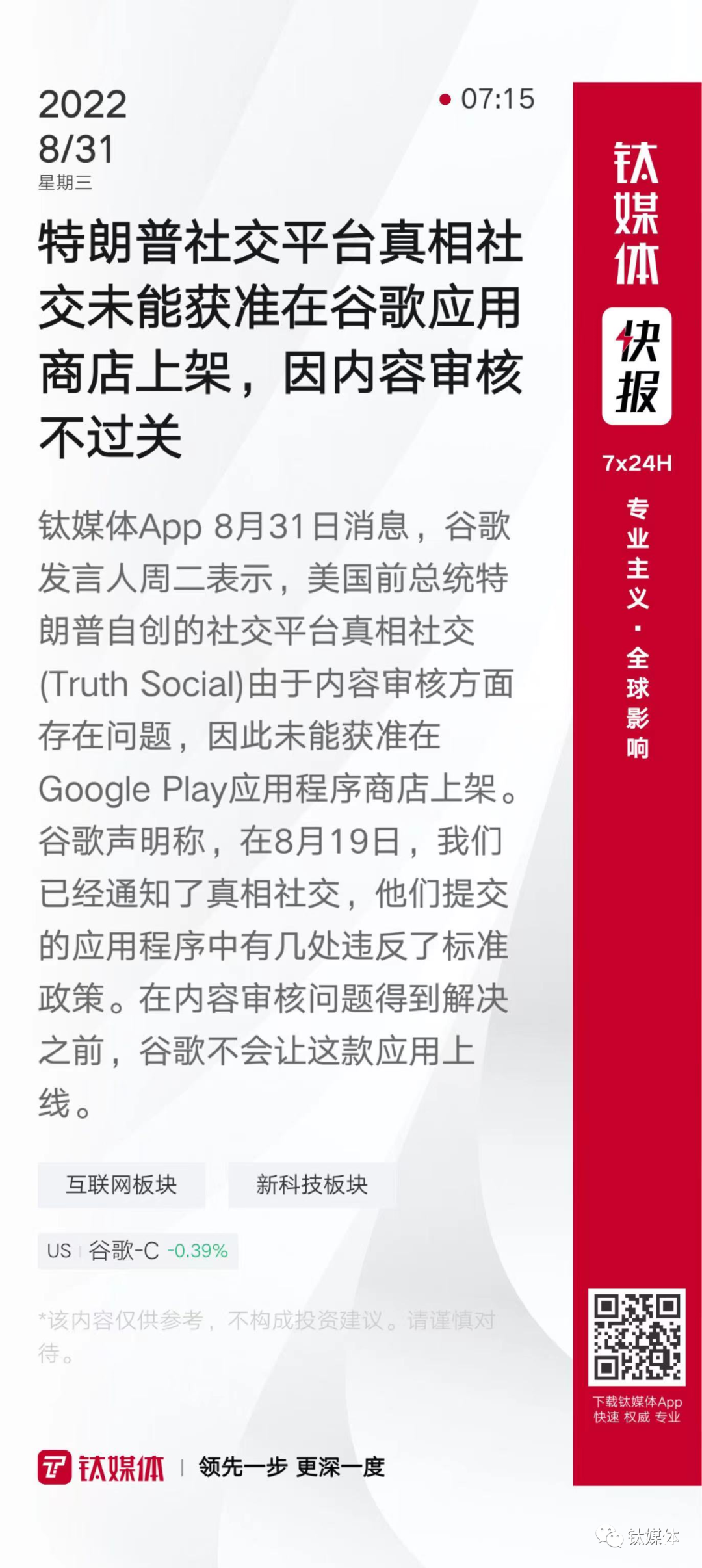 【特朗普社交平台真相社交未能获准在谷歌应用商店上架,因内容审核不过关】