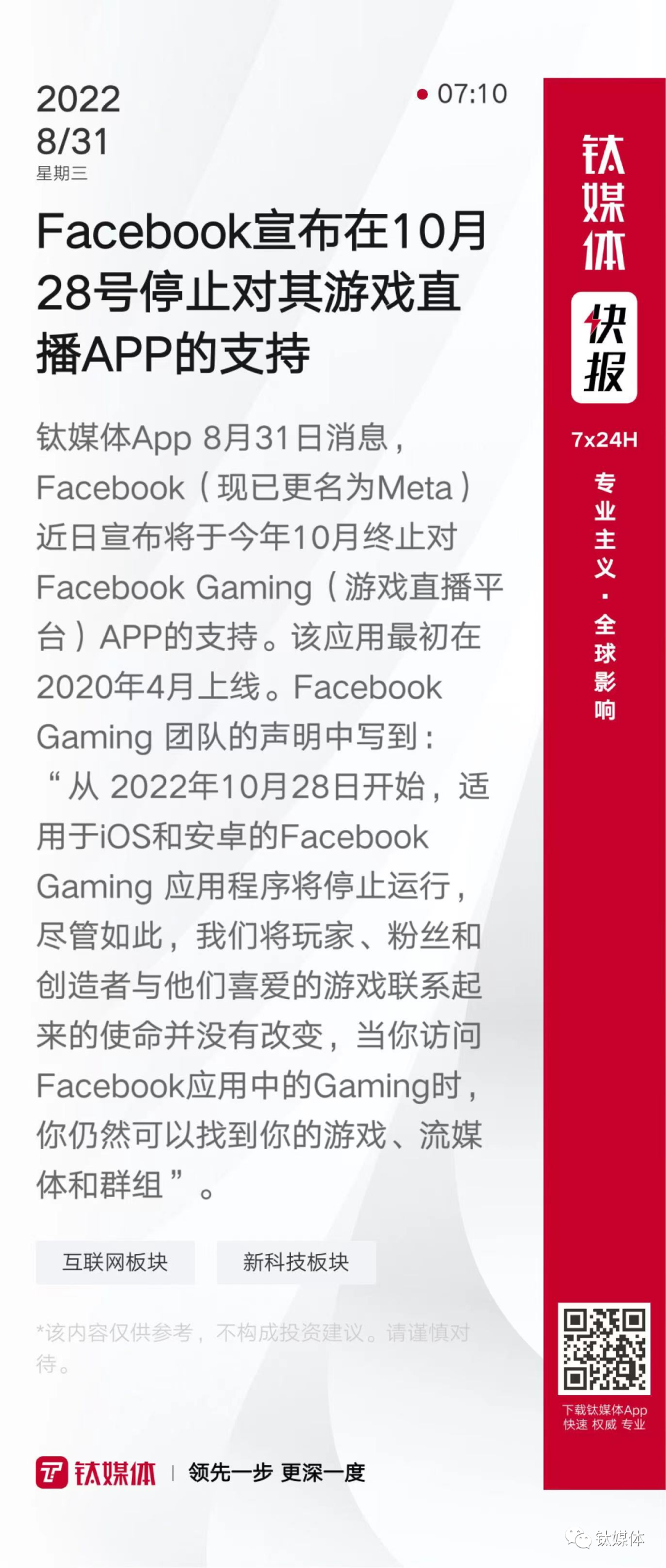 【Facebook宣布在10月28号停止对其游戏直播APP的支持】