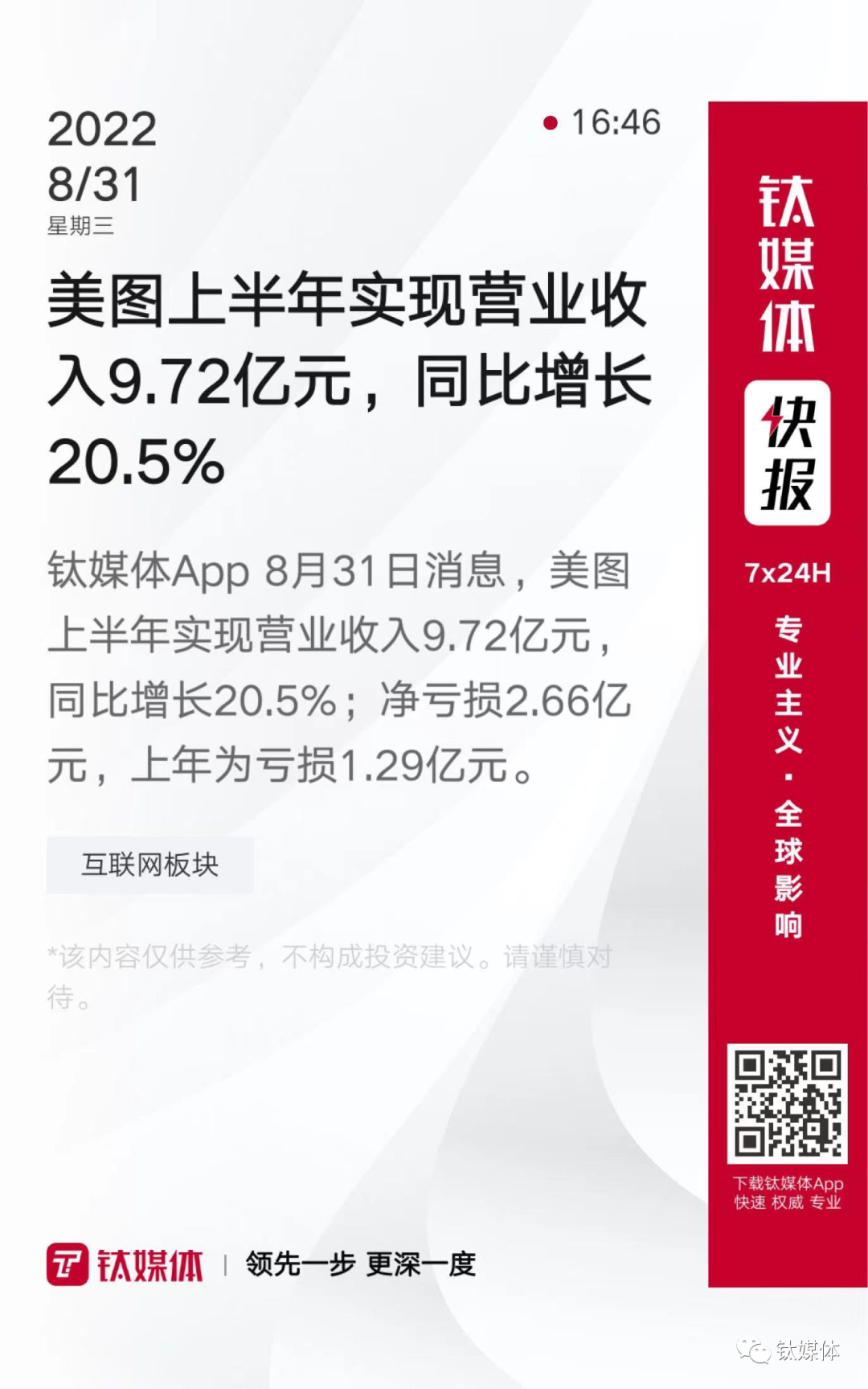 【美图上半年实现营业收入9.72亿元,同比增长20.5%】