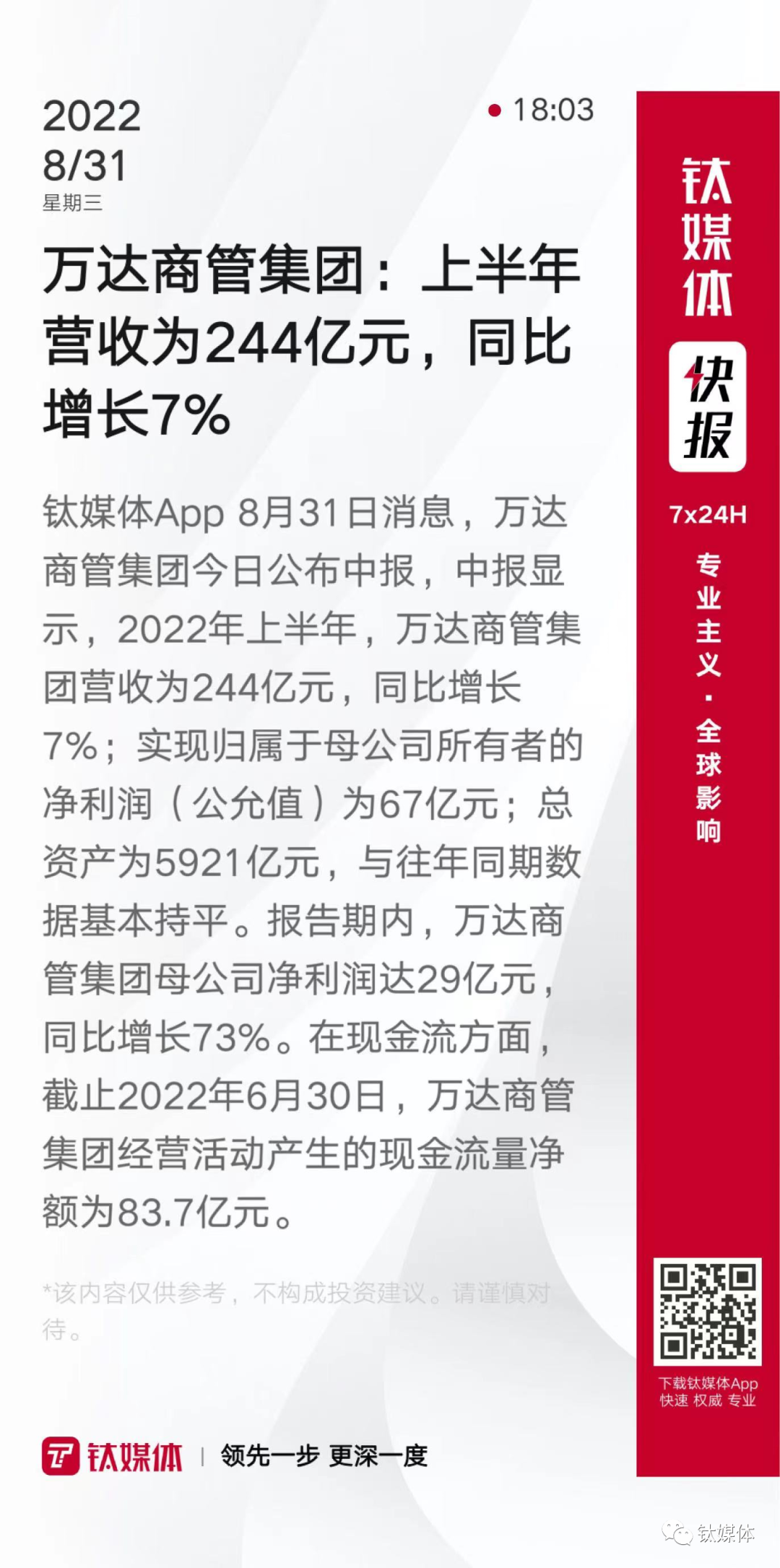 【万达商管集团:上半年营收为244亿元,同比增长7%】