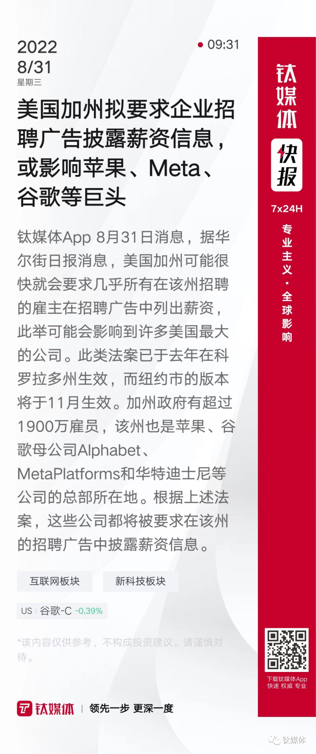 【美国加州拟要求企业招聘广告披露薪资信息,或影响苹果、Meta、谷歌等巨头】