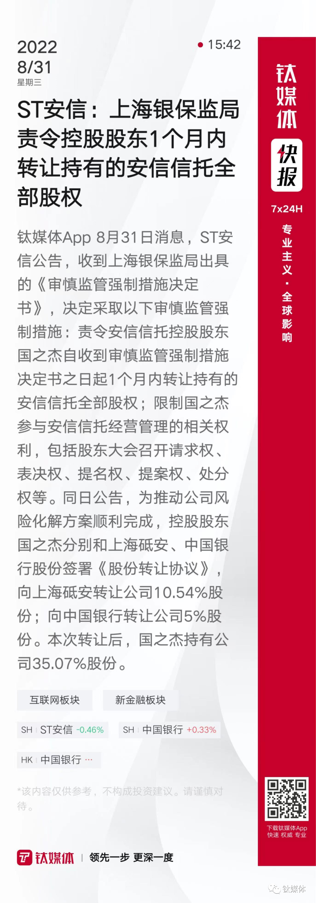 【ST安信:上海银保监局责令控股股东1个月内转让持有的安信信托全部股权】