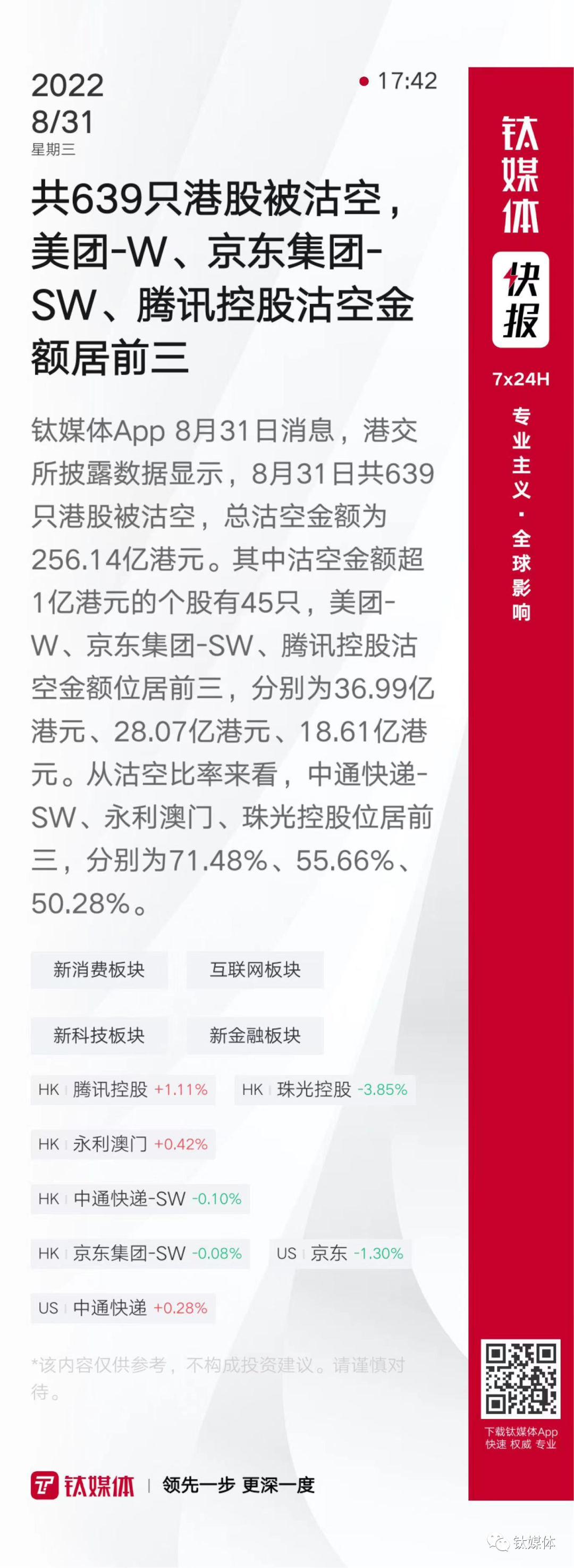 【共639只港股被沽空,美团-W、京东集团-SW、腾讯控股沽空金额居前三】