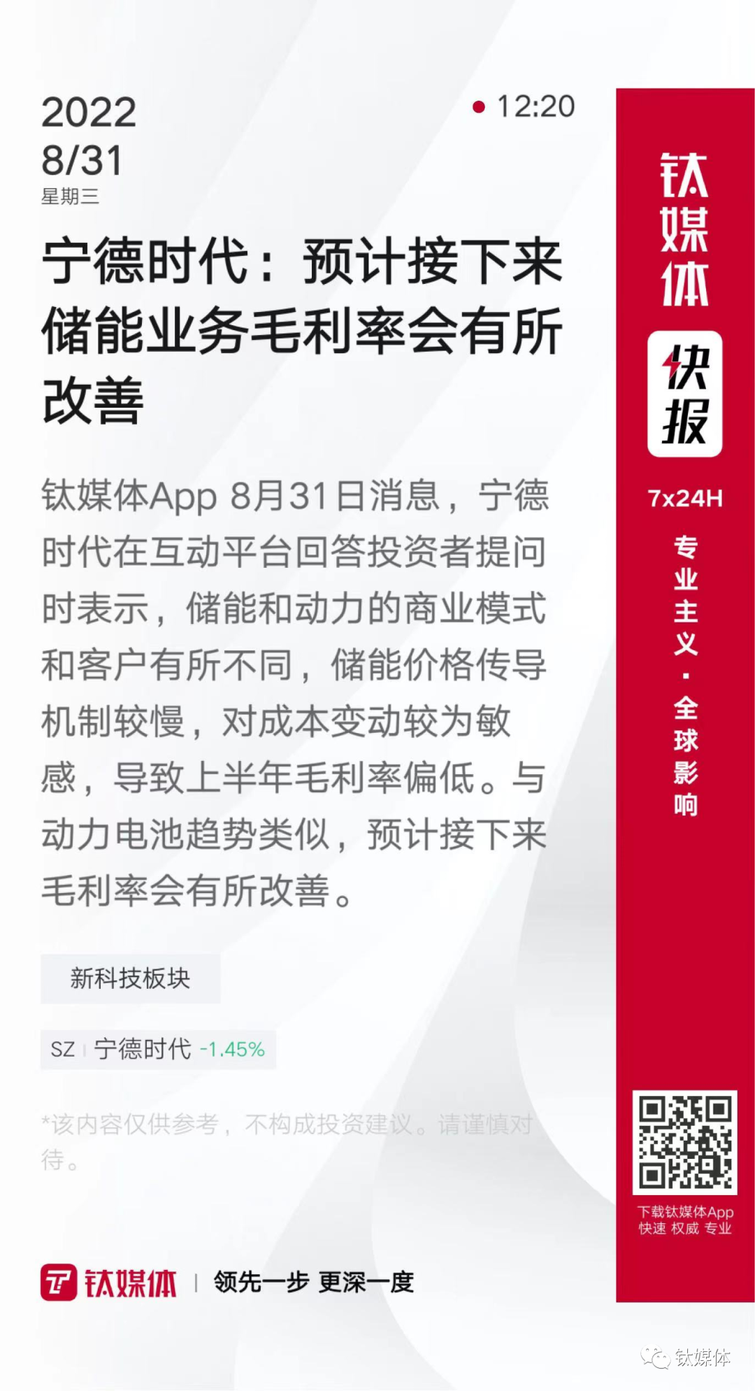 【宁德时代:预计接下来储能业务毛利率会有所改善】