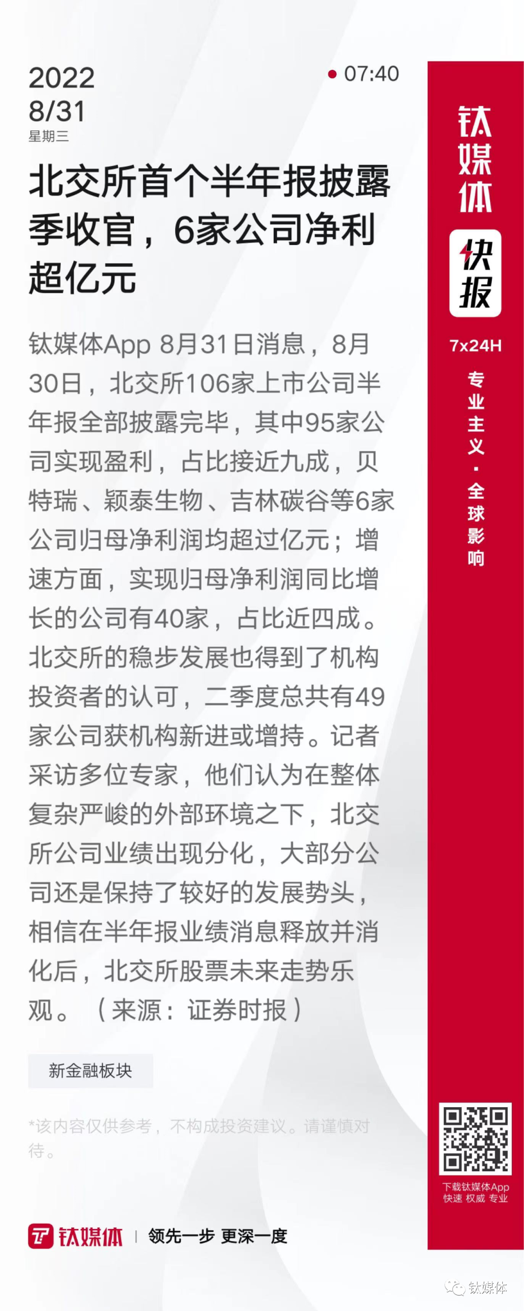 【北交所首个半年报披露季收官,6家公司净利超亿元】