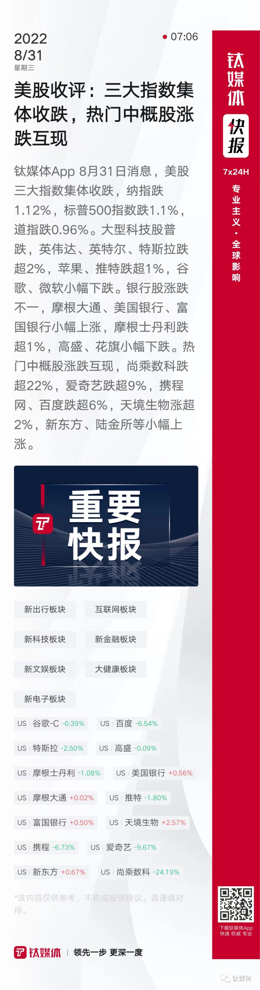 【美股收评:三大指数集体收跌,热门中概股涨跌互现】