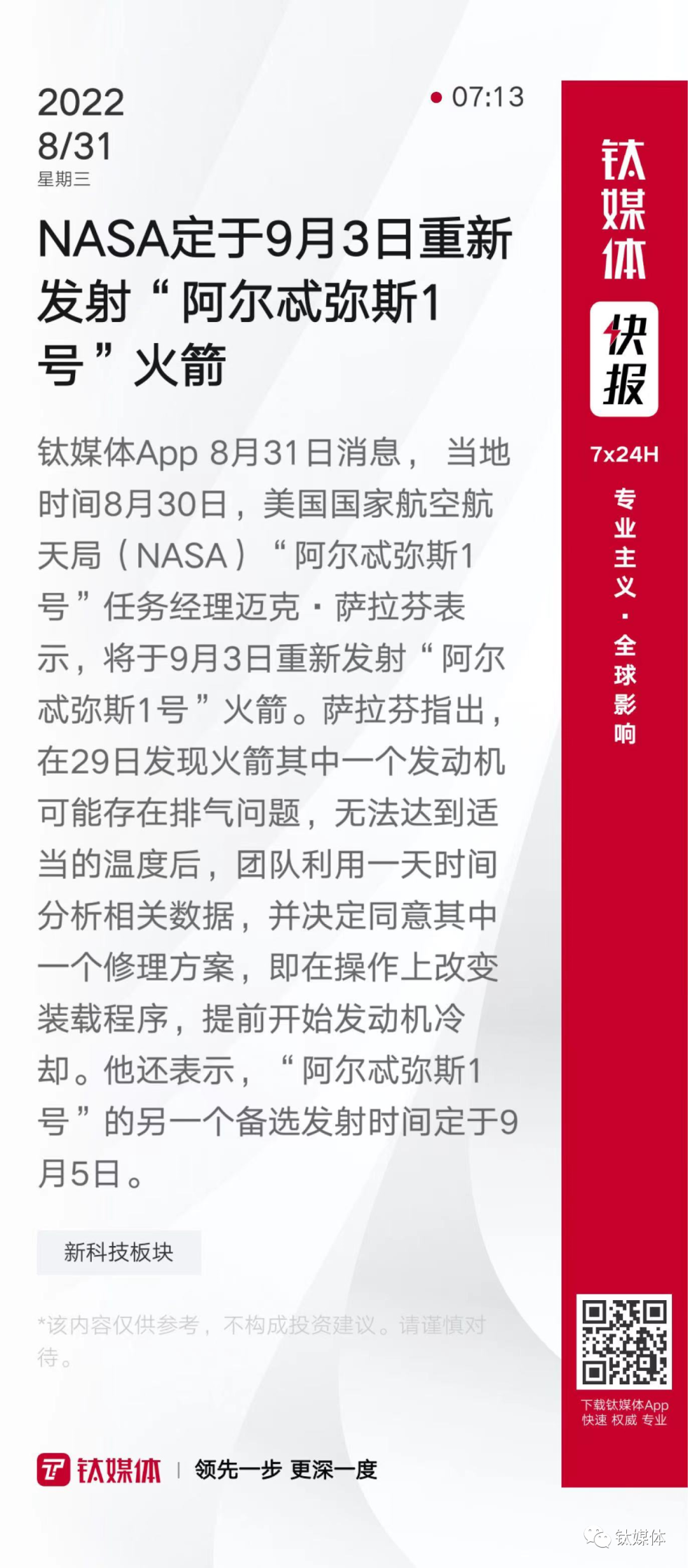 【NASA定于9月3日重新发射“阿尔忒弥斯1号”火箭】