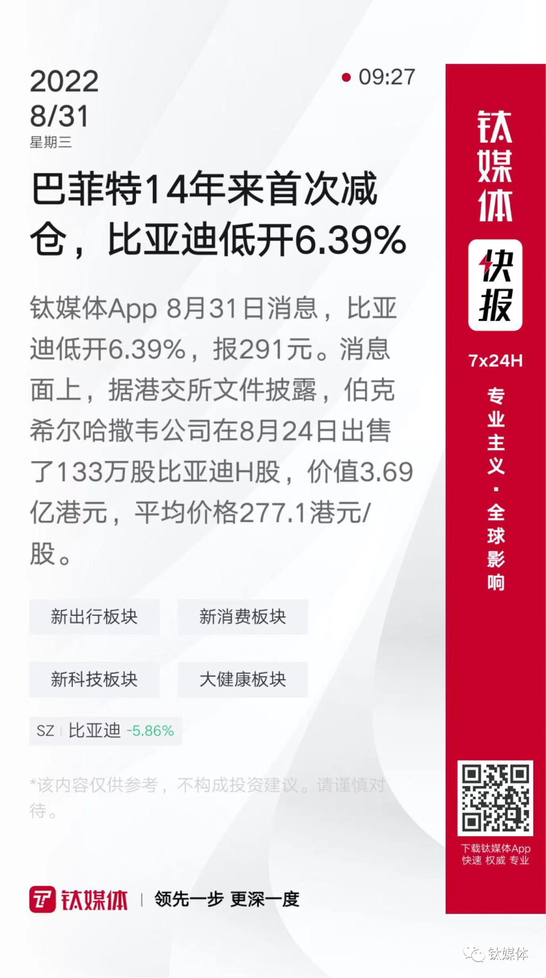 【巴菲特14年来首次减仓,比亚迪低开6.39%】
