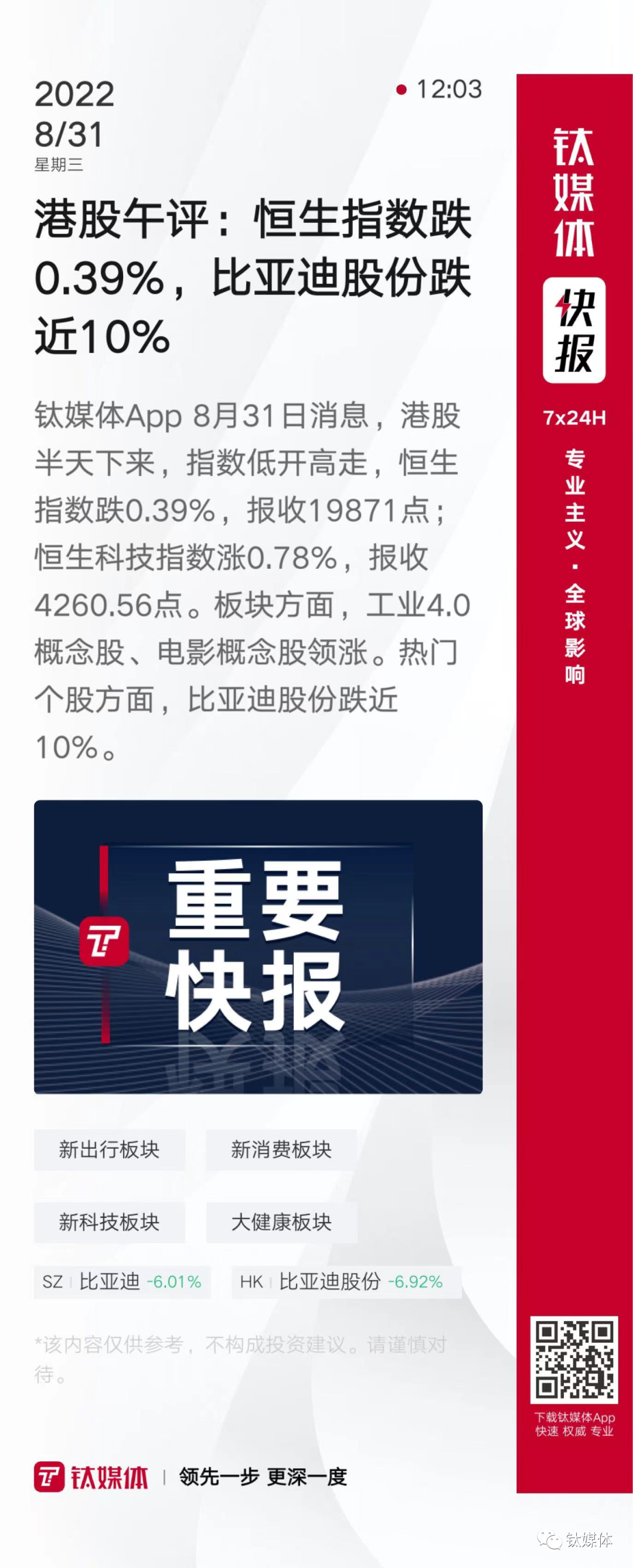 【港股午评:恒生指数跌0.39%,比亚迪股份跌近10%】