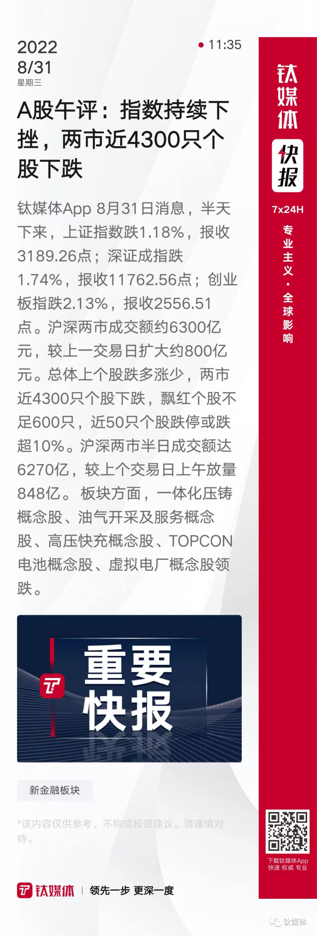 【A股午评:指数持续下挫,两市近4300只个股下跌】