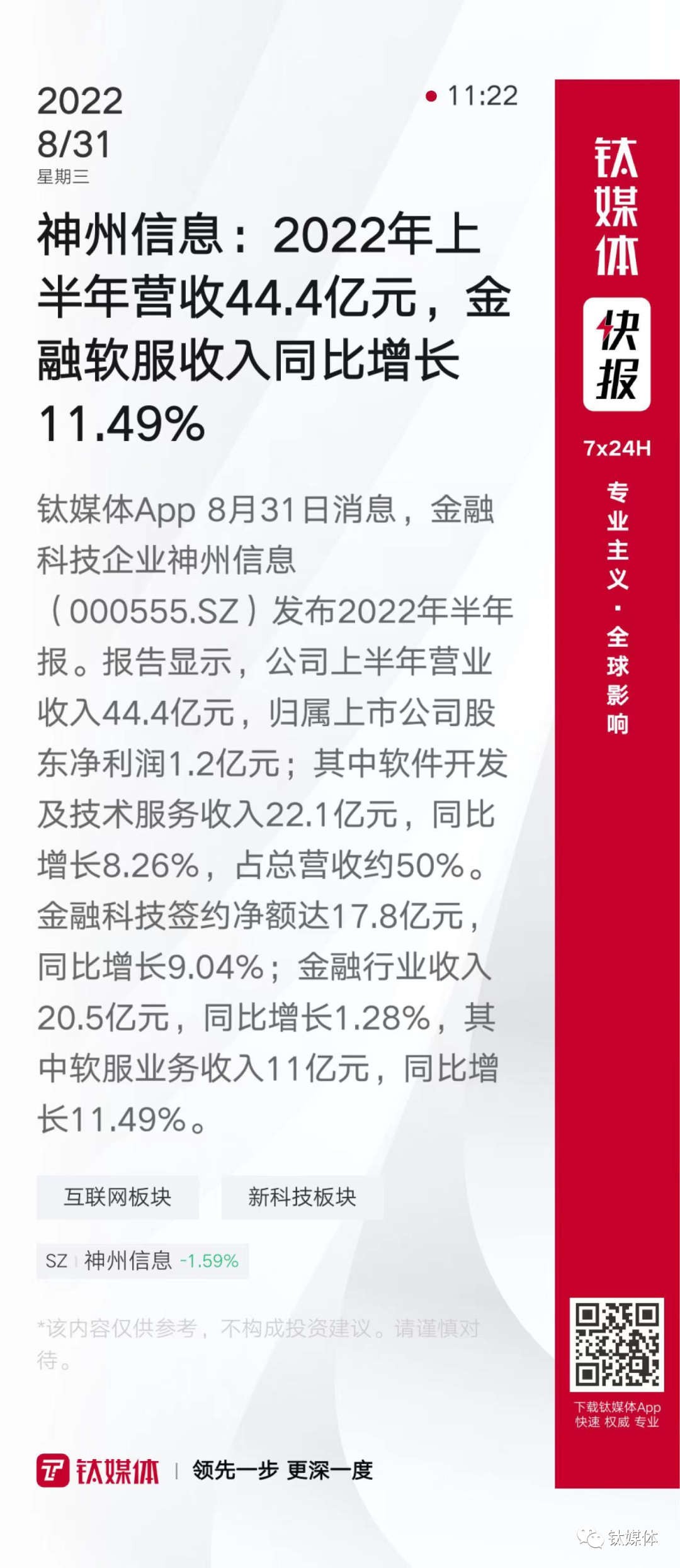 【神州信息:2022年上半年营收44.4亿元,金融软服收入同比增长11.49%】
