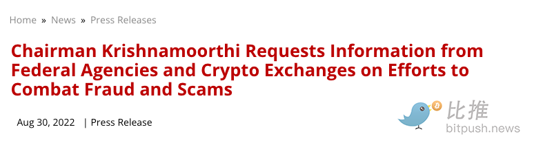 周二,众议院监督和改革委员会经济和消费者政策小组委员会主席Raja Krishnamoorthi致函美国最大的加密交易所,要求提供“信息和文件”,说明每家公司是如何“打击与加密货币相关的欺诈行为”。该委员会是美国众议院的一部分,众议院与美国参议院一起组成国会,可以提出和辩论法案和其他立法措施,包括监管加密货币的法律。