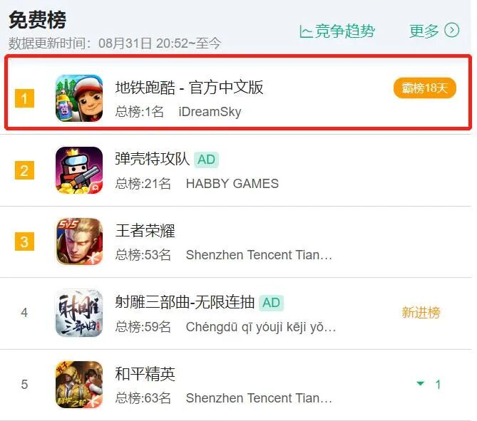 根据七麦数据显示,截至目前,由创梦天地代理发行的《地铁跑酷》已经霸占iOS免费榜18天,同时另一款代理发行的《神庙逃亡》也处在iOS免费榜前列。