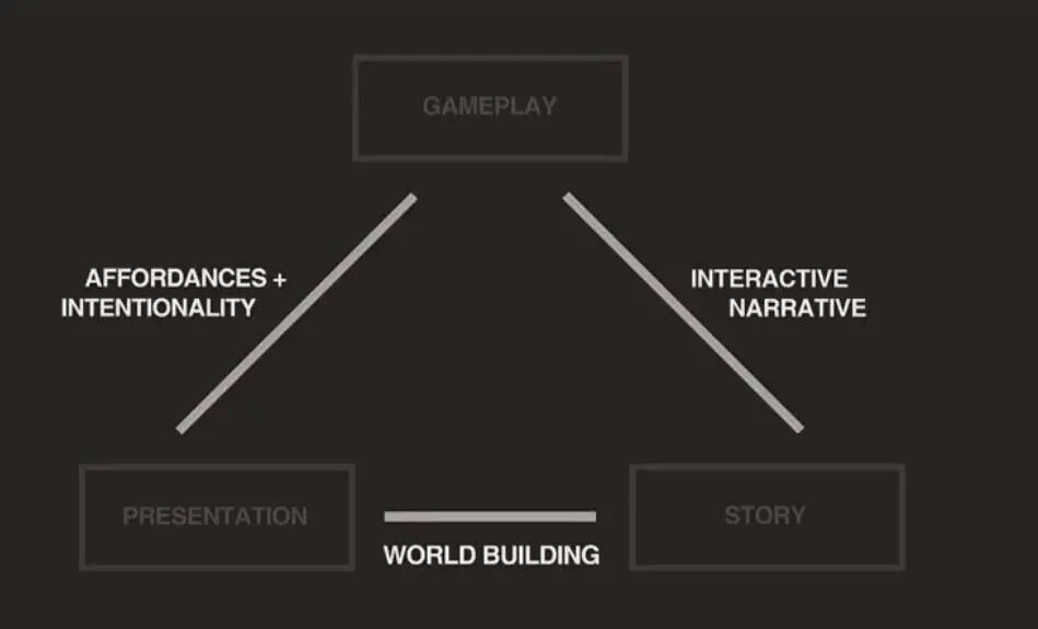 在呈现与玩法之间,我要说的是功能可见性(Affordance)和目的性(Intentionality);在呈现方式与故事之间,出现了世界打造的概念;在玩法与故事之间,存在的是互动叙事。所以,今天的分享是总结和突出这些关系,以及我们可以如何将其用到关卡设计上。