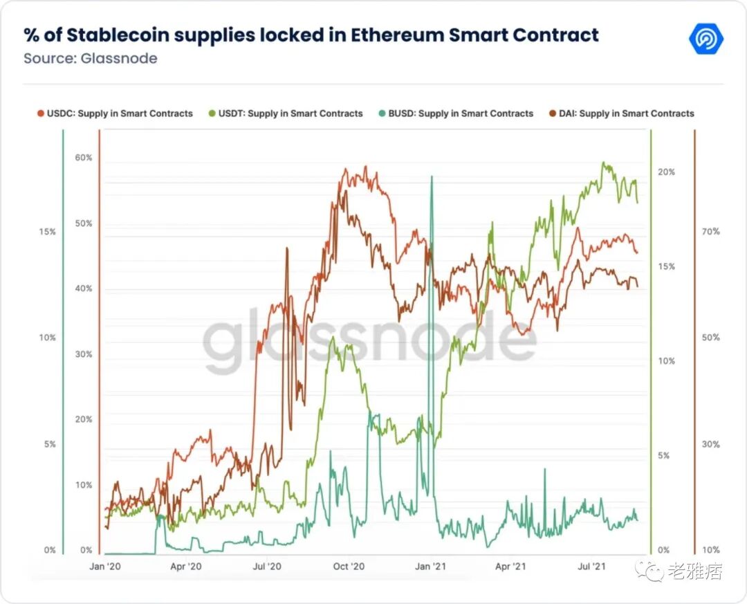 虽然未经证实,但行业衡量DeFi参与规模的指标包括被“锁定”在以太坊智能合约中的稳定币的百分比。以太坊目前是DeFi协议和应用程序在其上运行的最主要的区块链。这就是为什么“合并”是区块链历史上最令人期待的事件之一的原因,一旦过渡完成,它会引发许多关于稳定币稳定性的问题。