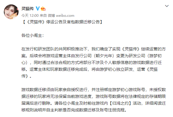 今日,朝夕光年旗下手游《灵猫传》发布“停运及官包数据迁移”公告。官方表示“经过发行和研发的积极推动,《灵猫传》将继续实现运营,运营主体由原来的发行公司(朝夕光年)变更为研发公司(游梦初心),同时将合法合规的将不涉及敏感信息的游戏数据进行迁移。运营主体和玩家数据迁移完成后,将由游梦初心独立研发、运营《灵猫传》。”