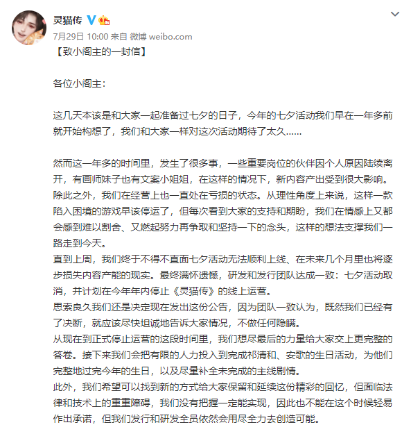 据了解,上个月底《灵猫传》官方就曾表示,由于画师,文案等重要岗位的伙伴相继离职,新内容的产出受到很大影响,官方也在持续亏损的情况下苦苦支撑,迫不得已只能做出在年内停止运营的决定。