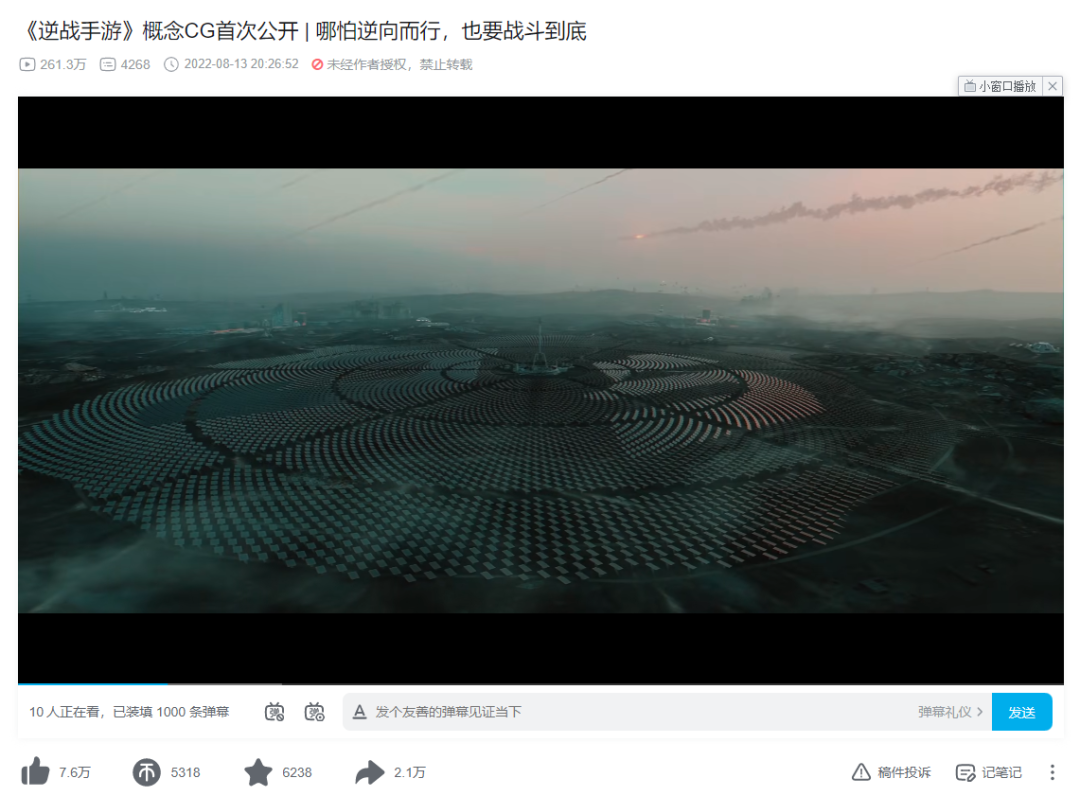 8月13日,借着“逆战”IP十周年之际,天美首次曝光了《逆战》手游的概念CG宣传片。仅在B站,这段不到2分钟的“炫技”视频就获得了超260万的观看量。