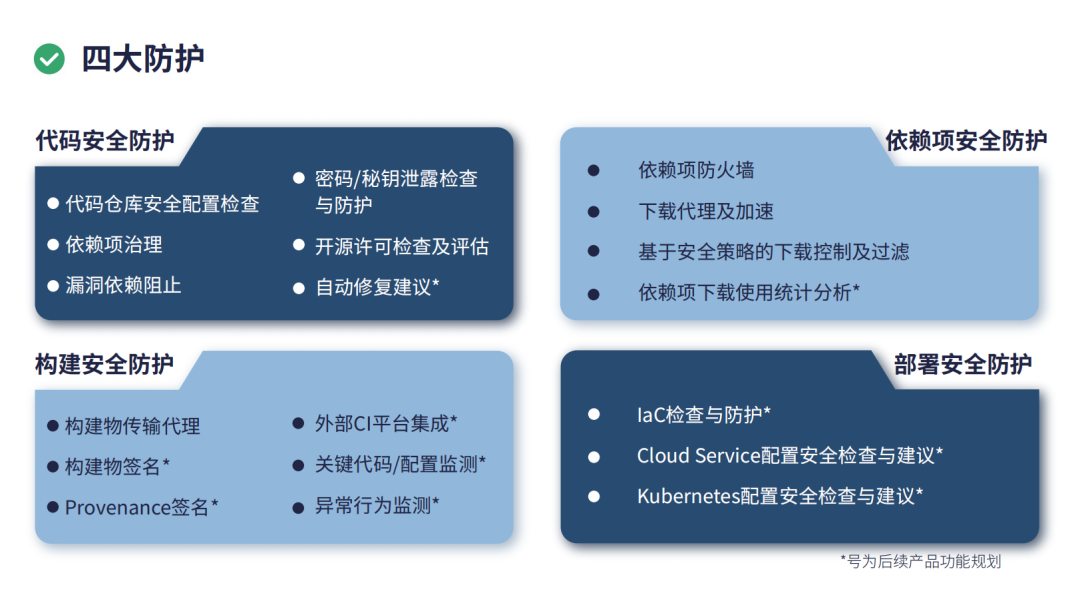 安全左移:在代码提交、依赖引入阶段开始进行安全防护,使用户及时发现漏洞或其他问题并以低成本对其进行修复。