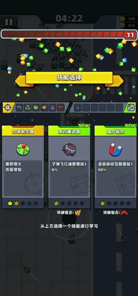 从玩法层面上来看,《蛋壳特攻队》同样可以说是复刻了《吸血鬼幸存者》的核心玩法。自动攻击、技能选取、超级技能合成等要素齐全,玩家同样仅需单手操作,就能完成走位、攻击和技能选择,体验割草爽感。