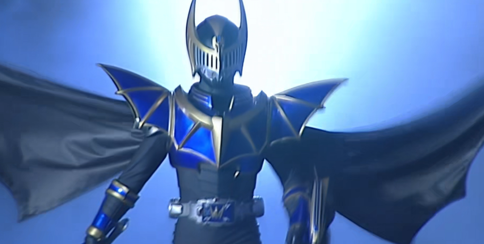 尽管当时年少不懂事,连作品的名字都没能记住,但影片中那副拉风的场景倒是深深地刻在了我的DNA里。记得那是一片水泥楼内,一位穿着紧身衣的皮套人用装逼的慢动作摆着帅气的POSE。周围刮着股一看就很假的风,把这位以蓝金色为主基调的骑士身后的披风吹得老高。背后的大聚光灯刻意突显明暗对比,颇有几分“黑暗骑士”的感觉。电视里的蛇形怪人看呆了,电视机前的我也看呆了,十几年后我才知道,这位骑士的名字叫做“夜骑”。