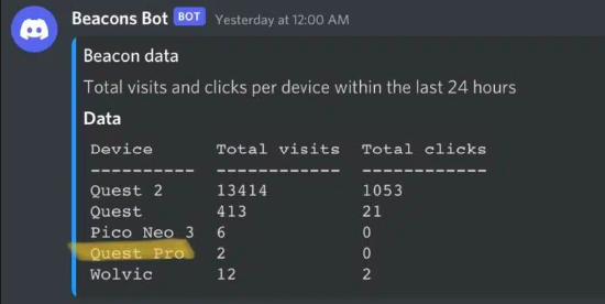 WebXR 沉浸式广告提供商 Zesty 联合创始人在推特上发布了这一发现。数据显示在 24 小时内有多少特定头显或浏览器通过 Zesty 广告访问了 WebXR 内容。其中,Quest 2 占据了绝大多数流量,Quest 和 Pico Neo 3 也在其中。另外还出现了一款名为 Quest Pro 的新设备。