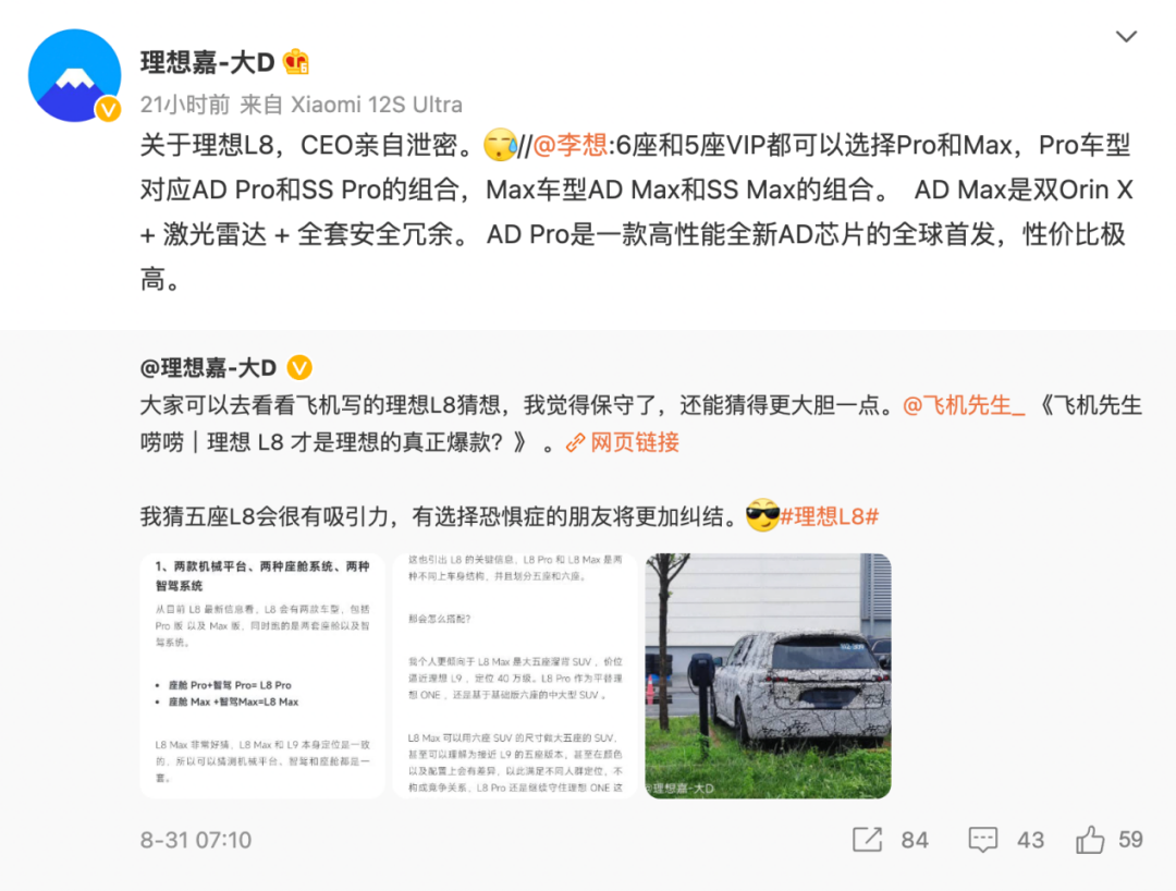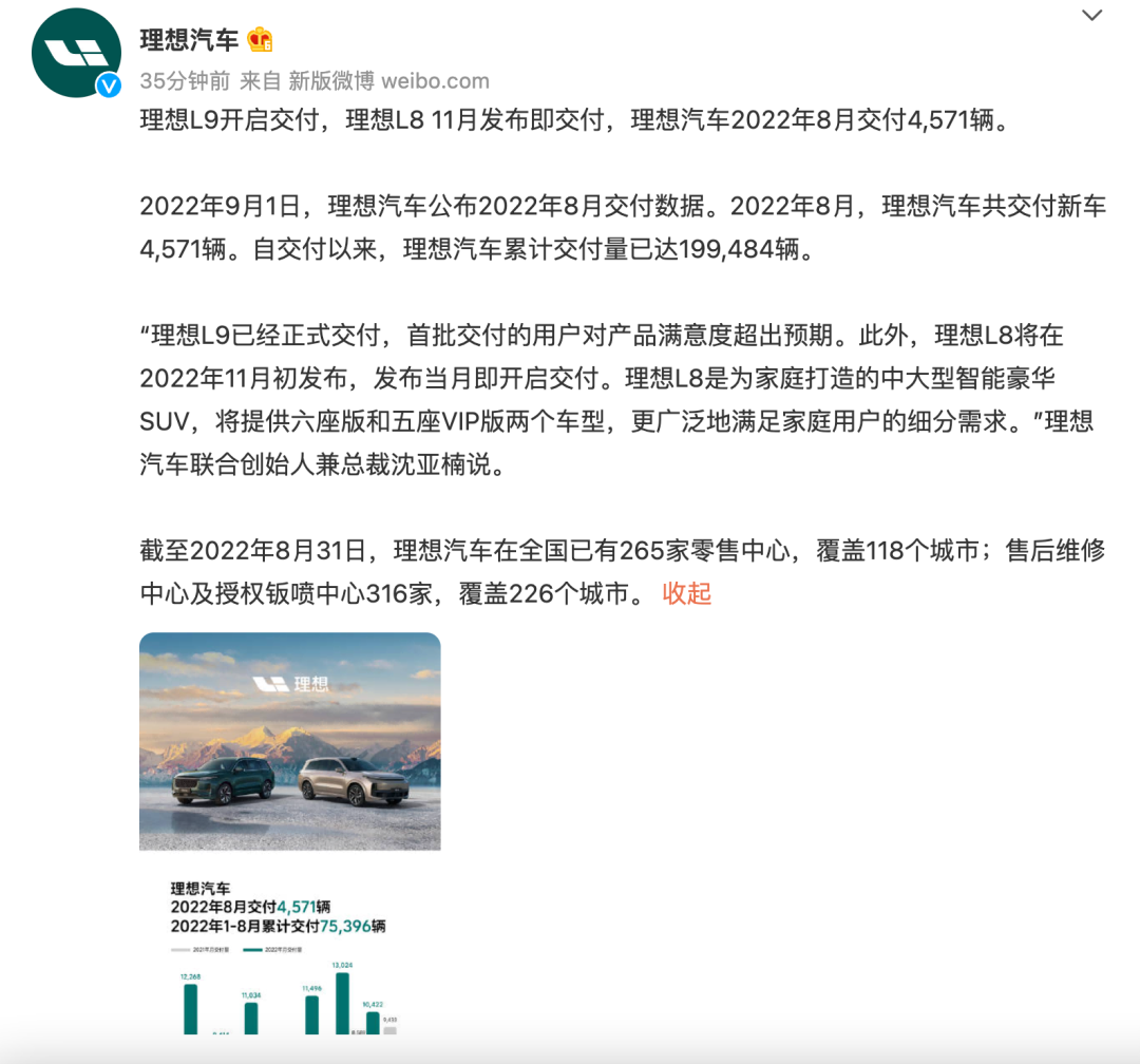 近日,理想新车理想L9正式开启交付,并且在今日公布了其2022年8月份的交付成绩。根据官方数据,2022年8月,理想汽车共交付新车4571辆。自交付以来,理想汽车累计交付量已达199484辆。而理想L9由于之前一直是预定状态,所以其预定量并没有算入其中。不过据了解,自6月21日发布以来,理想L9累计预订量已经超过5万,其中,确认定购定单数量已经超过3万。此外理想官方还表示,自7月15日开启试驾以来,全国已有超过12万用户体验理想L9。此外值得注意的是,理想在其微博中还提到了其新车理想L8 11月发布即交付。理想汽车CEO李想在近期也在微博上透露了一些有关于理想L8的信息。他表示理想L8将提供6座和5座VIP两种座椅布局,根据辅助驾驶、智能座舱提供Pro和Max两款车型。李想表示,Pro车型对应AD Pro和SS Pro的组合,Max车型AD Max和SS Max的组合。AD Max是双Orin X+激光雷达+全套安全冗余。AD Pro是一款高性能全新AD芯片的全球首发,性价比极高。理想L8 Pro车型提供5座+AD Pro+SS Pro、6座+AD Pro+SS Pro两种配置;理想L8 Max车型则为5座+AD Max+SS Max、6座AD Max+SS Max。此外李想还表示:“两个车型总共四个配置,4个SKU,四倍于ONE的压强攻打中大型SUV市场”。根据之前的爆料,理想L8该车虽然也属于中大型SUV,但定位低于理想L9,或为理想ONE的升级改款。爆料信息显示,理想L8车长为5030mm,轴距3000mm,售价区间为30-40万元,将对标GLE。而根据谍照,理想L8采用了理想 L9同款平台设计,包括内饰,尺寸可能会比L9稍小一些,类似一款按比例缩小的L9,轴距比理想ONE长了65mm。