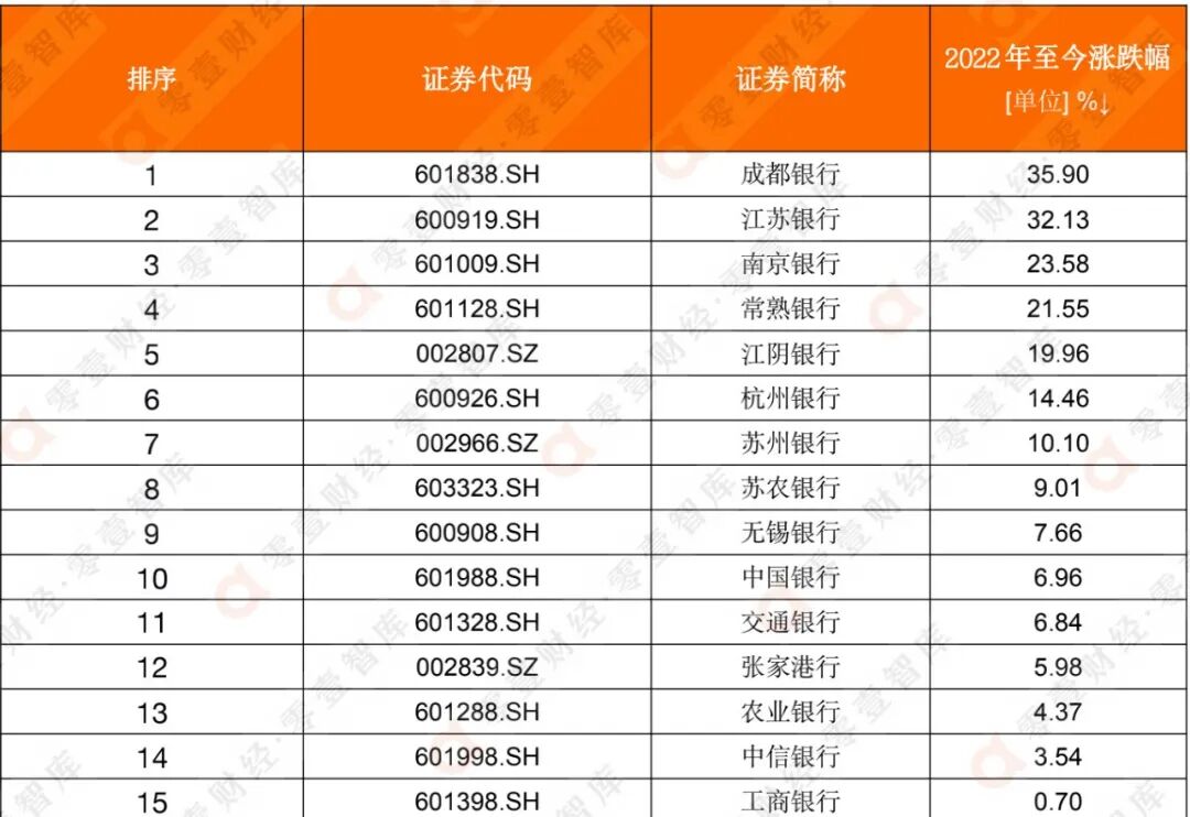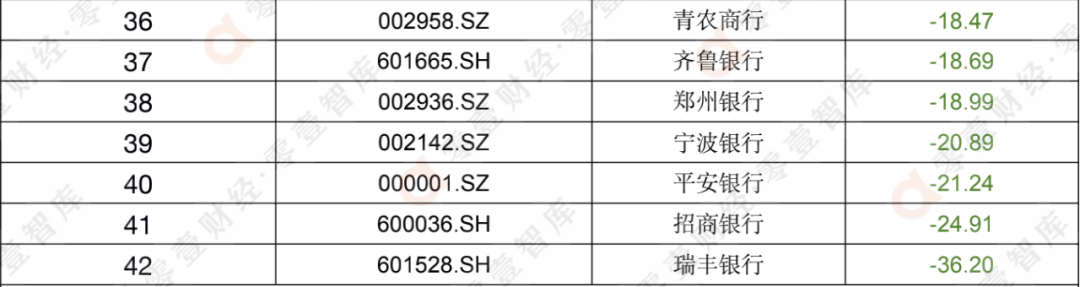 八、2022年以来涨跌幅:26家银行股价下跌,瑞丰银行下跌最多