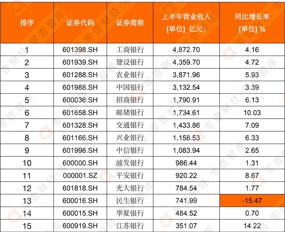 零壹智库根据Wind数据统计发现,上半年,营收超过百亿的上市银行达24家;从营收同比增长率来看,上半年共有37家上市银行实现正增长,其中13家同比增长达10%以上。另有5家营收同比下降,民生银行(600016.SH)下滑超15%。