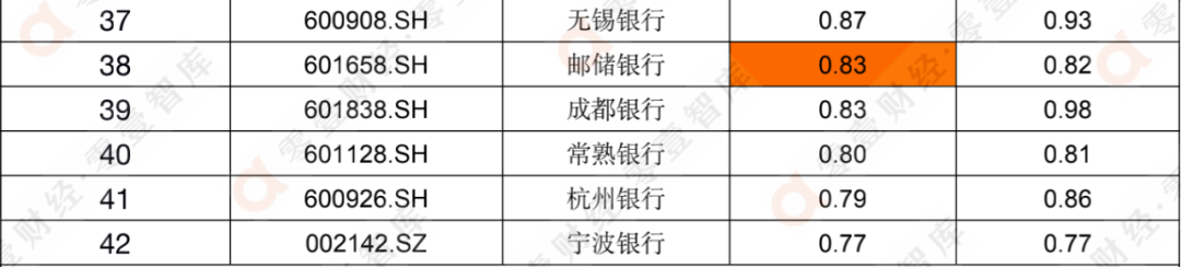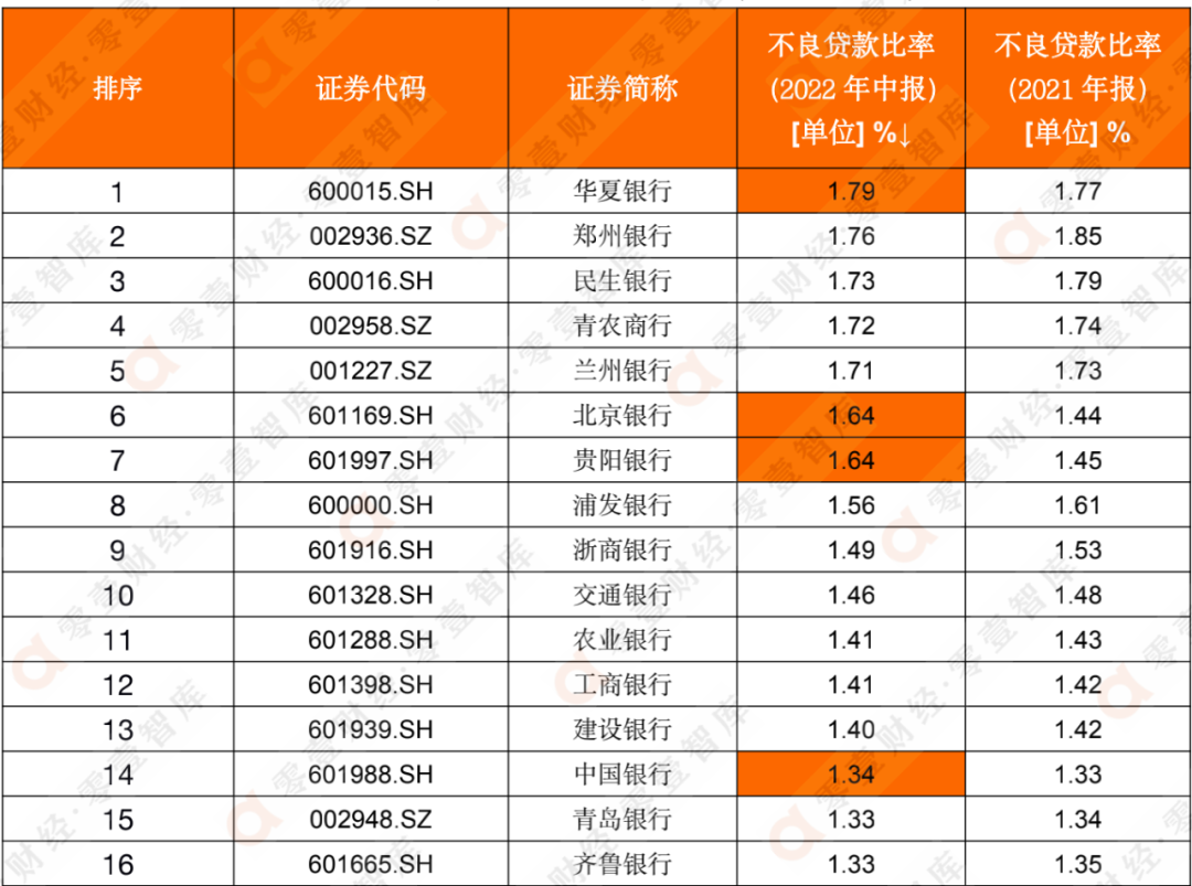 表4:A股上市银行不良贷款率排名(2022年中报)