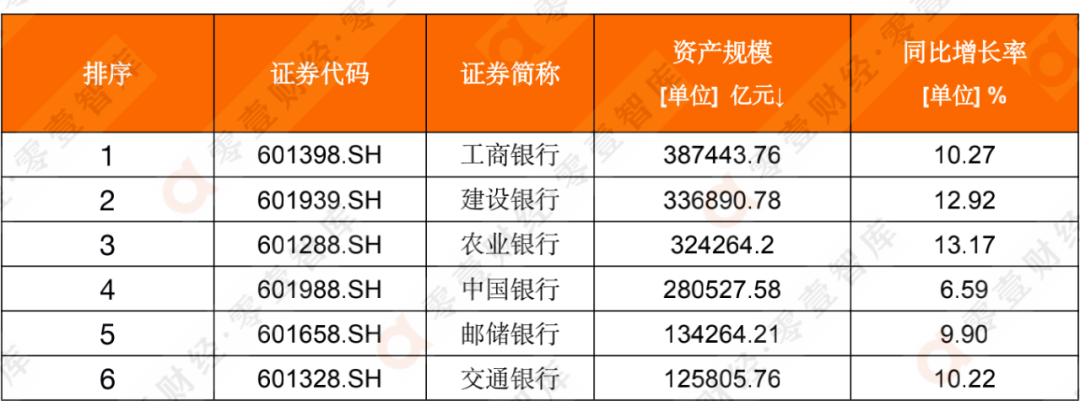 一、资产规模:6家银行超过10万亿,仅一家同比下降