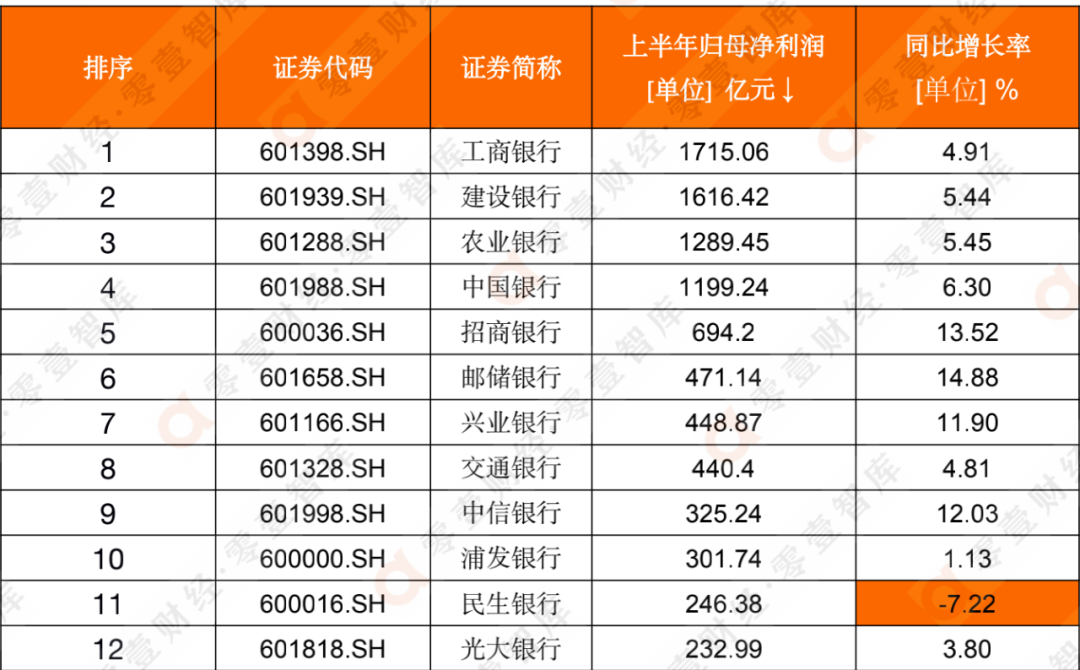 上半年,归母净利润超过百亿元的上市银行达19家;从净利润同比增长率来看,上半年共有40家上市银行实现正增长,仅民生银行、西安银行(600928.SH)归母净利润同比下降7.22%、13.45%。