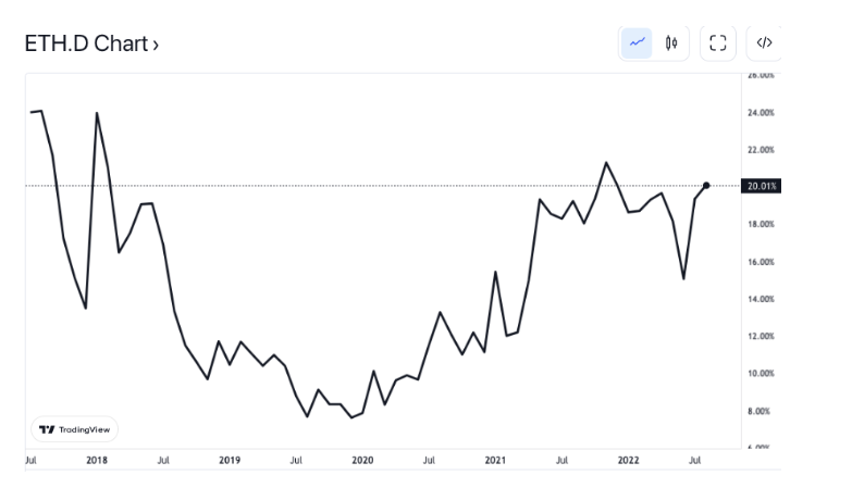 ETH.D 并没有随着熊市崩盘——相反,它自 2021 年 11 月以来一直保持在 20% 的大致水平,而 BTC.D 自 2021 年 5 月以来一直大致稳定。