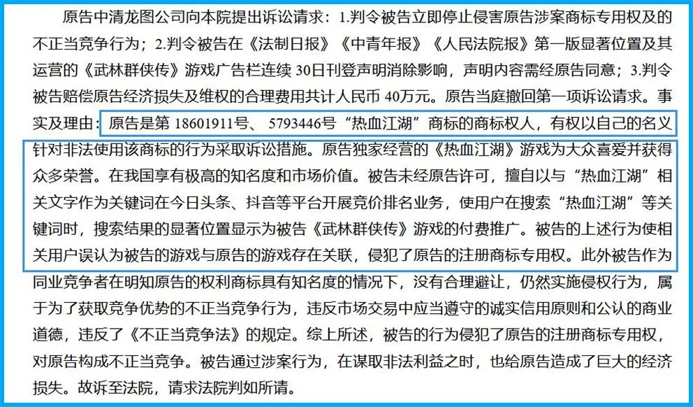 中清龙图称平头哥公司在推广《武林群侠传》的过程中,将“热血江湖”相关文字作为关键词在今日头条、抖音等平台开展竞价排名业务,使玩家在搜索“热血江湖”等关键词时,显著位置显示的是《武林群侠传》。法院一审认为平头哥公司在宣传推广《武林闲侠转》过程中确实侵权了“热血江湖”商标,判决平头哥公司赔偿中清龙图12.2万元损失。