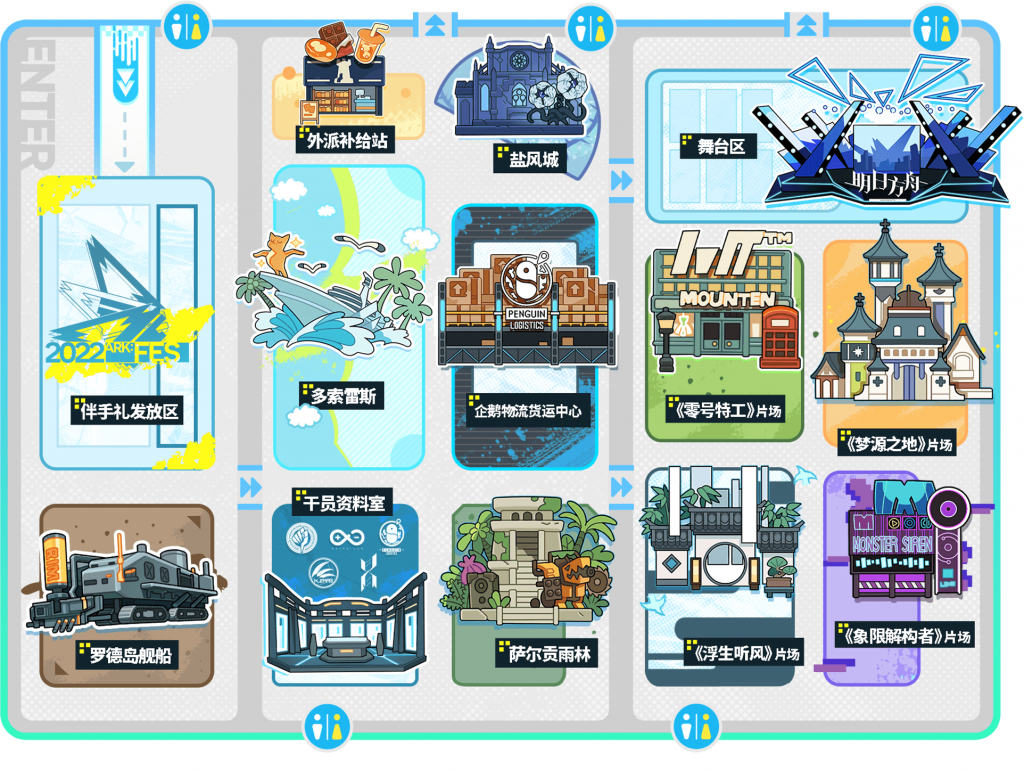 在新情报中,官方没有公布今年嘉年华的场地面积,但从其公布的展区概念图来看,每个展区的占地并不小,比如罗德岛舰船和象限结构者等展区。以罗德岛舰船中黄色栏杆长度取值0.5米进行估算,单个展区的面积至少在100平方米以上。