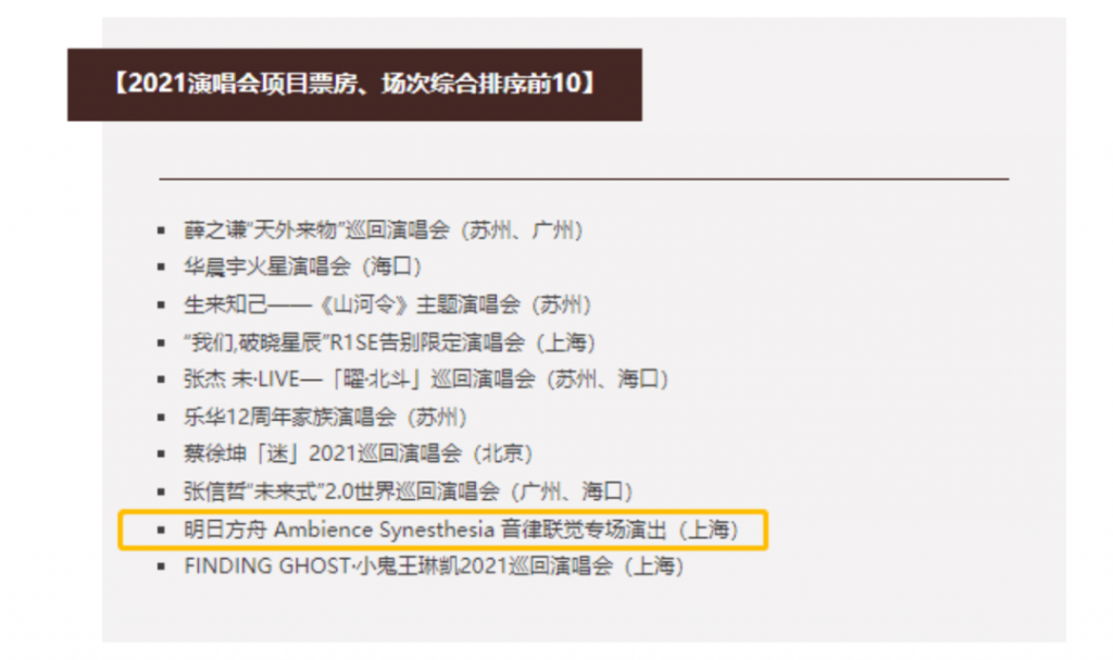 2021年,《明日方舟》首次举办了“音律联觉”专场演出,一经出现就震惊了行业。一年后,中国演出行业协会发布了《2021全国演出市场年度报告》。其中“演唱会项目票房场次综合排序前10”的入选列表中,作为游戏专场演出的“音律联觉”跃身出现于各大演唱会的名目之间。
