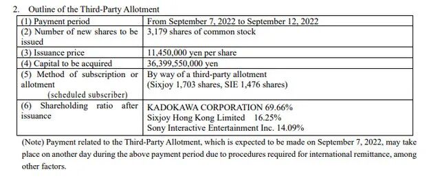 根据角川的声明,此次FromSoftware以每股1145万日元的价格,发行了3179股普通新股,总价值为364亿日元,约合2.62亿美元,其中腾讯Sixjoy持1703股,合195亿日元,约合1.4亿美元;索尼持1476股,合169亿日元,约合1.21亿美元。第三方付款预计将在9月7日至12日完成。
