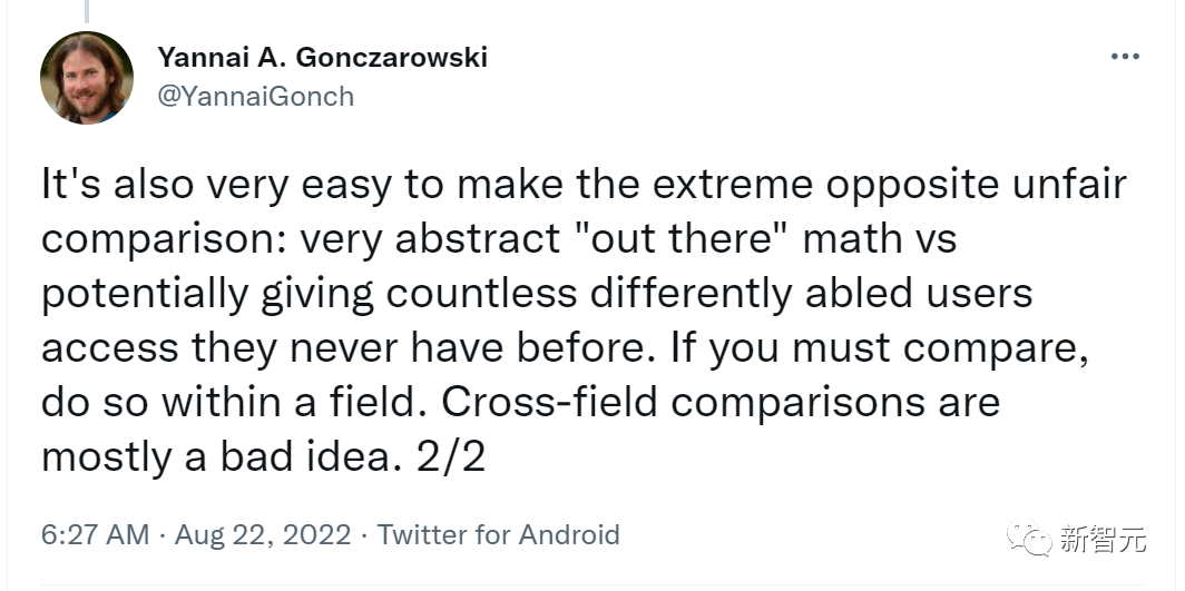 他还说,如果真的要比较,就在一个领域内比较,跨领域的比较一般都不靠谱。