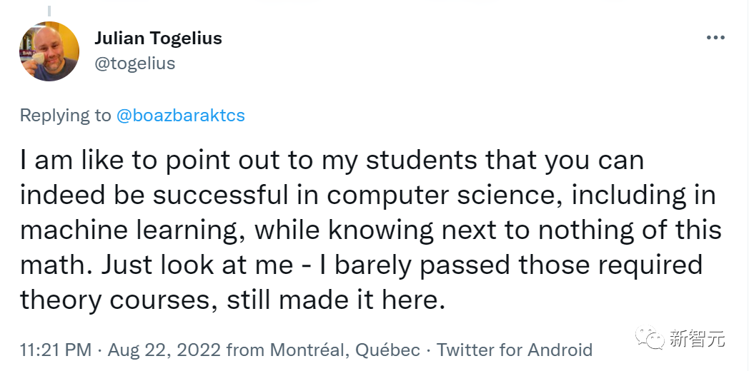 纽约大学副教朱利安·托格里斯也加入讨论,他认为,确实可以在对数学领域「几乎一无所知」的情况下,在CS领域取得成功,包括在机器学习。