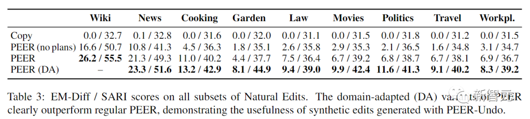 在Natural Edits的所有子集上评估PEER后可以发现,计划对各领域都有很大的帮助,这表明理解维基百科编辑中的计划的能力可以直接转移到其他领域。重要的是,在Natural Edits的所有子集上,PEER的领域适应性变体明显优于常规的PEER,尤其是在园艺、政治和电影子集上有很大的改进(分别为84%、71%和48%的EM-Diff),也显示了在不同领域中应用PEER时,生成合成编辑的有效性。