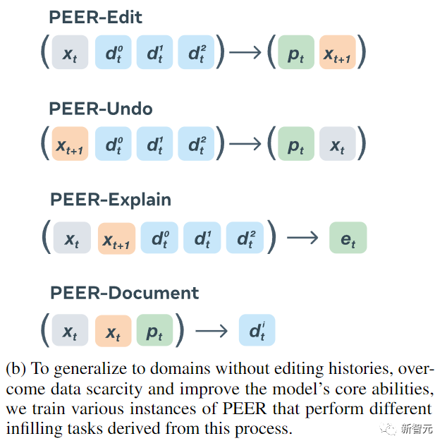 最重要的是,研究人员训练了多个PEER的实例,能够填补写作过程中的多个环节,借此可以使用自训练(self-training)技术提高训练数据的质量、数量以及多样性。