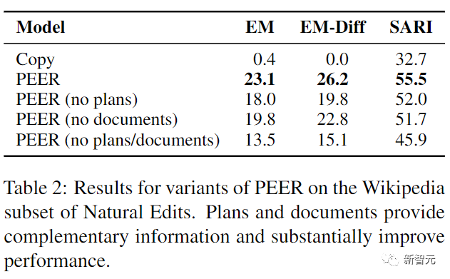 实验结果可以看出PEER的表现在一定程度上超过了所有的基线,并且计划和文档提供了模型能够使用的互补信息